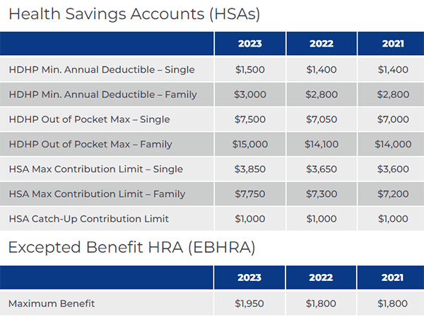 On April 29, 2022, the IRS announced the 2023 Health Savings Account contribution limits and the 2023 Excepted Benefit HRA benefit maximum within their release of Revenue Procedure 2022-24. The contribution limit for HSAs varies based on coverage type and age, with higher limits for individuals aged 55 and older. Employer contributions to HSAs are not taxable income for employees. Additionally, there are different contribution limits for family and self-only coverage, with family coverage generally allowing for higher contributions.