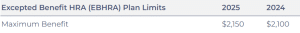For plan years starting in 2025, the maximum amount an employer can make newly available in an excepted benefit EBHRA is $2,150. Excepted benefit EBHRAs are designed to cover certain limited benefits, such as vision or dental, that are not covered by traditional health plans.